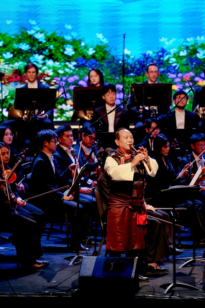 藝術形式的創(chuàng)新融合是本次音樂會的一大亮點。二重唱《茉莉與格?!穬?yōu)美詮釋了民族文化的交流共生;器樂演奏《“飛弦踏春”與“賽馬”》則讓著名二胡演奏家陳軍的激昂琴聲與扎念琴演奏員措姆的熱情彈奏展開對話,碰撞出令人振奮的藝術火花。從展現拉薩當代生活的電視劇插曲《藍天上的云》,到描繪鄉(xiāng)村振興新貌的《童話里的格林村》,再到融合原生態(tài)山歌與專業(yè)唱法、曾為中央代表團獻唱的《珠穆朗瑪》,一系列新創(chuàng)作品生動展現了傳統與現代交織、充滿活力的社會主義新西藏。