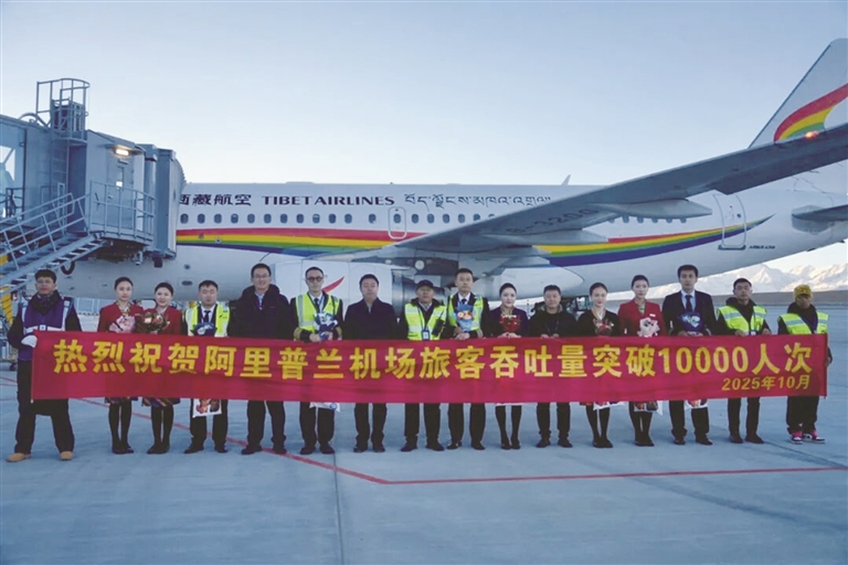 10月20日,西藏航空TV9705航班平穩(wěn)降落在阿里普蘭機場,作為阿里普蘭機場2025年第10000名旅客,乘客果果在工作人員的掌聲中走下飛機,接受機場工作人員敬獻的哈達和鮮花。這一刻,是阿里普蘭機場實現(xiàn)年旅客吞吐量“從千到萬”的歷史性跨越。