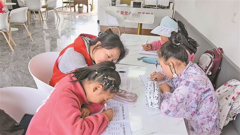蔡公堂街道白定村黨委開展的托班服務(wù)上,孩子們?cè)谡J(rèn)真寫作業(yè)。