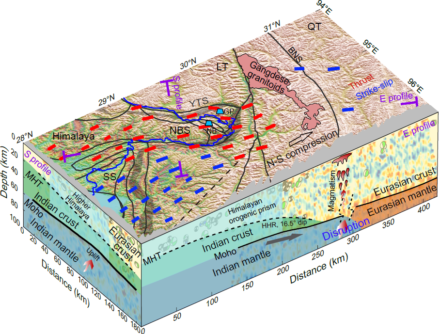 喜馬拉雅山脈由印度板塊與歐亞板塊碰撞形成,一段時期以來,科學家對其中段的地震機制已有較清晰認識,但對地質(zhì)構(gòu)造更為復雜的東段仍了解有限。中國科學院青藏高原研究所一項研究首次揭示:印度板塊以低角度俯沖至青藏高原下方,并與特殊的“斜坡式”斷裂構(gòu)造共同主導著喜馬拉雅東端的地震活動與地表隆升過程。該成果近日發(fā)表于學術(shù)期刊《國家科學評論》。
