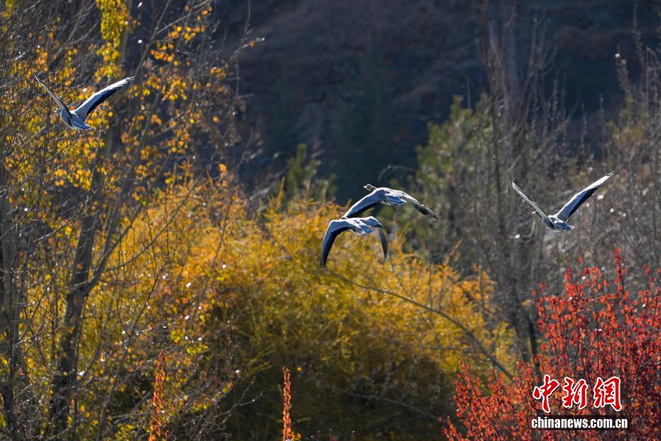 11月17日,西藏拉薩迎來(lái)大批越冬候鳥(niǎo)。拉薩河、宗角祿康公園等地,成為了它們的棲息天堂。在宗角祿康公園內(nèi),赤麻鴨、斑頭雁成群結(jié)隊(duì),時(shí)而低頭覓食,時(shí)而水中嬉戲。它們的身影引得市民和游客紛紛駐足觀賞、拍照留念,構(gòu)成了一幅人與自然和諧共生的美麗畫(huà)卷。圖為斑頭雁從宗角祿康公園上方飛過(guò)。貢確 攝