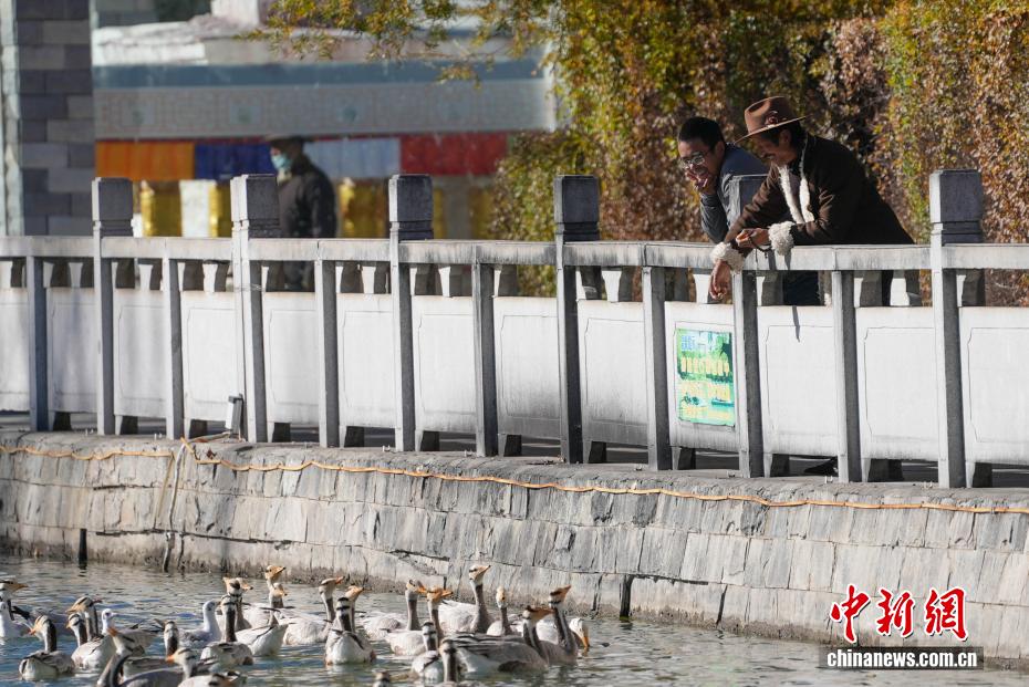 11月17日,西藏拉薩迎來(lái)大批越冬候鳥(niǎo)。拉薩河、宗角祿康公園等地,成為了它們的棲息天堂。在宗角祿康公園內(nèi),赤麻鴨、斑頭雁成群結(jié)隊(duì),時(shí)而低頭覓食,時(shí)而水中嬉戲。它們的身影引得市民和游客紛紛駐足觀賞、拍照留念,構(gòu)成了一幅人與自然和諧共生的美麗畫(huà)卷。圖為市民在宗角祿康公園內(nèi)投喂候鳥(niǎo)。貢確 攝