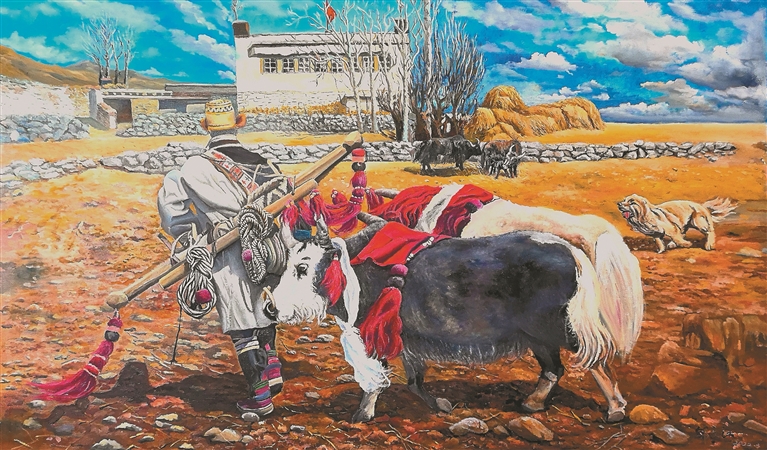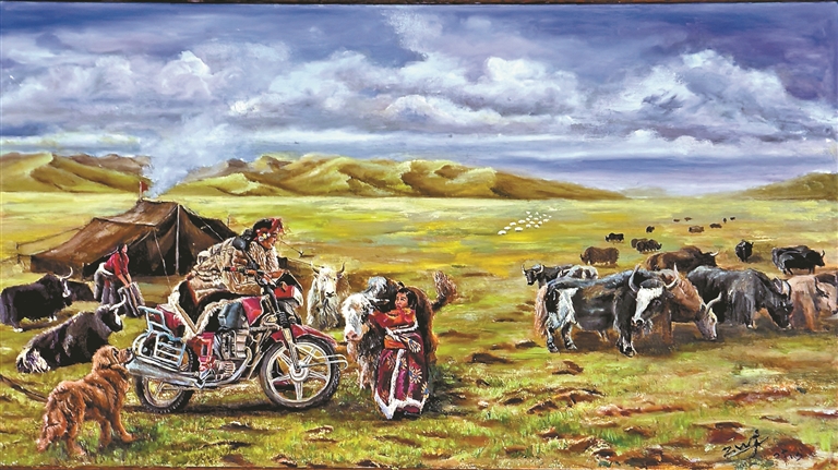 在鄒文江的畫筆下,《草原新景》展現(xiàn)的是牧民騎著摩托車放牧,藍天白云下,現(xiàn)代化的交通工具與遠處的雪山相映成趣;《記憶——紀念修建川藏公路》描繪的是十八軍戰(zhàn)士修建川藏公路時的險峻場景,崇山峻嶺間,奔騰不息的怒江咆哮而過,正在修路的十八軍戰(zhàn)士顯得渺小又偉大;《邊陲人家》記錄的是一戶邊境牧民家庭悠閑放牧的生活場景……他的作品中,既有圣潔的雪山、遼闊的草原、成群的牦牛,也有現(xiàn)代化的學校、醫(yī)院、民居和牧民的笑容。