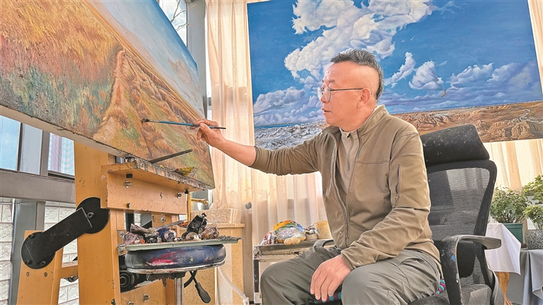 “《牧歸》是我的第一幅油畫作品,描繪的是牧民春耕回家的場景?!编u文江指著畫室一角已經(jīng)完成的作品說道。畫面上,夕陽余暉中,牧民背著傳統(tǒng)農(nóng)具趕著牦牛緩緩歸來,遠處炊煙裊裊,濃郁的生活氣息撲面而來。