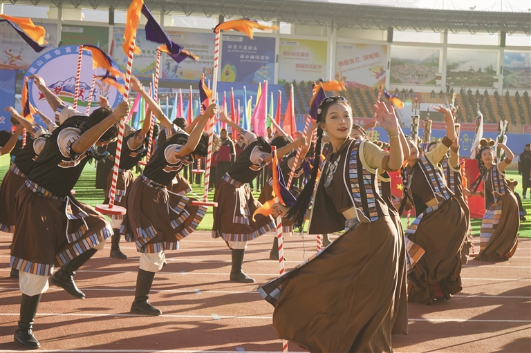 11時10分,山南市委書記李富忠宣布運動會開幕?,F(xiàn)場煙花絢爛綻放,火炬手點燃主火炬,跑道前后上演的賽馬、自行車、摩托車表演點燃全場熱情,歡呼聲、喝彩聲此起彼伏。 隨后的百人非遺文藝匯演精彩紛呈。尾聲《幸福雅礱》更是將現(xiàn)場氣氛推向高潮,展現(xiàn)出雅礱兒女對美好生活的向往。