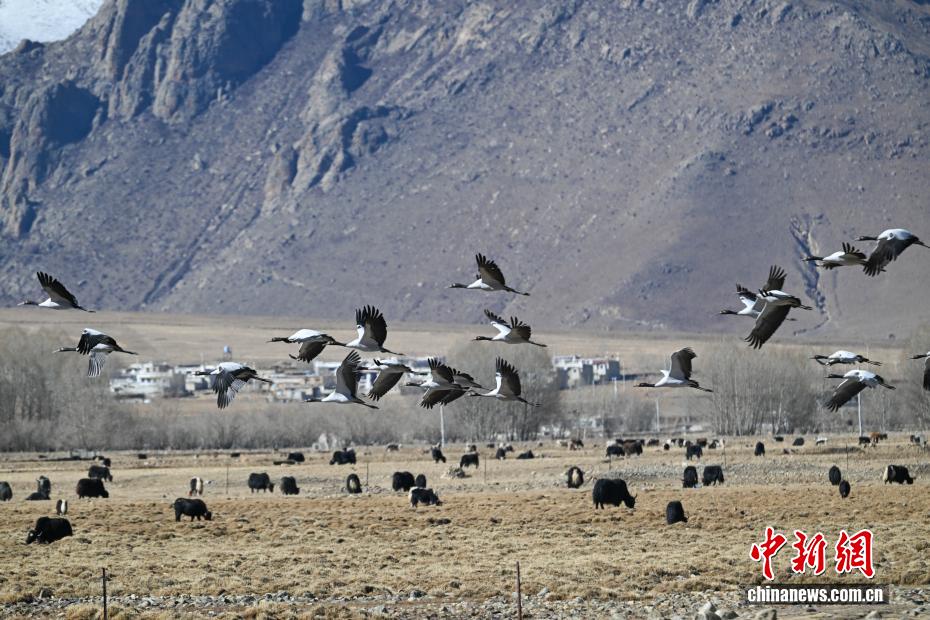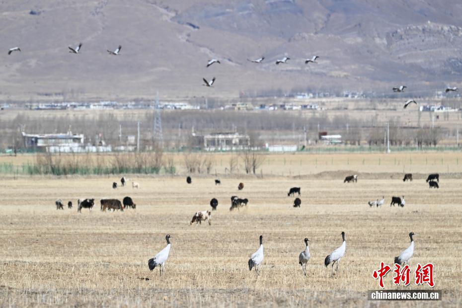11月26日,位于西藏自治區(qū)拉薩市林周縣的黑頸鶴自然保護區(qū)內,大量越冬的黑頸鶴在卡孜水庫、農田、濕地里覓食、嬉戲。林周縣位于拉薩河上游及澎波河流域,是黑頸鶴的主要越冬地之一。中新社記者 貢嘎來松 攝