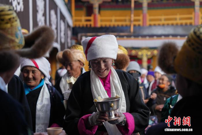 圖為白拉姆節(jié)臨近之際,信眾在大昭寺內(nèi)敬獻(xiàn)供品后載歌載舞的場景。貢確 攝