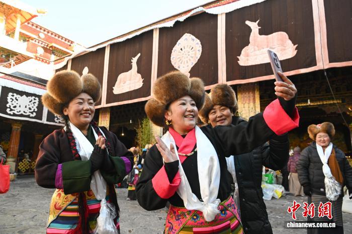 隨著藏歷十月十五白拉姆節(jié)(又稱“仙女節(jié)”)臨近,11月28日,西藏拉薩的婦女們?cè)诖笳阉绿陚鹘y(tǒng)舞蹈后自拍留念,迎接“仙女節(jié)”到來?!跋膳?jié)”即吉祥天母節(jié),藏語稱“白來日追”。相傳藏傳佛教最高護(hù)法神之一班丹拉姆的女兒白拉姆,不顧母親的反對(duì)與赤尊贊私定終身,班丹拉姆一怒之下將赤尊贊趕到拉薩河南岸,規(guī)定二人僅每年的藏歷十月十五日相見。中新社記者 貢嘎來松 攝