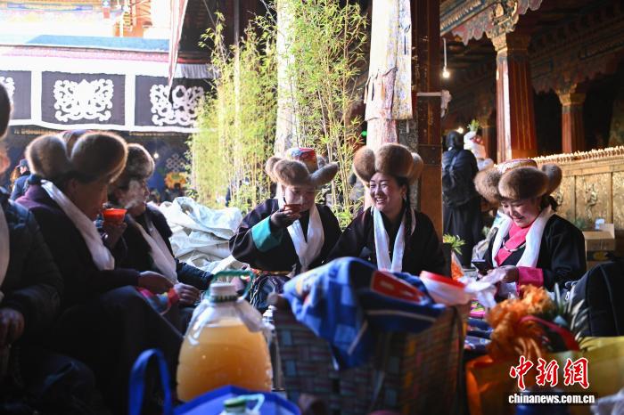 隨著藏歷十月十五白拉姆節(jié)(又稱“仙女節(jié)”)臨近,11月28日,西藏拉薩的婦女們?cè)诖笳阉绿陚鹘y(tǒng)舞蹈后休息,迎接“仙女節(jié)”到來?!跋膳?jié)”即吉祥天母節(jié),藏語稱“白來日追”。相傳藏傳佛教最高護(hù)法神之一班丹拉姆的女兒白拉姆,不顧母親的反對(duì)與赤尊贊私定終身,班丹拉姆一怒之下將赤尊贊趕到拉薩河南岸,規(guī)定二人僅每年的藏歷十月十五日相見。中新社記者 貢嘎來松 攝