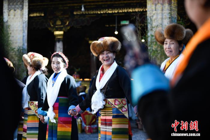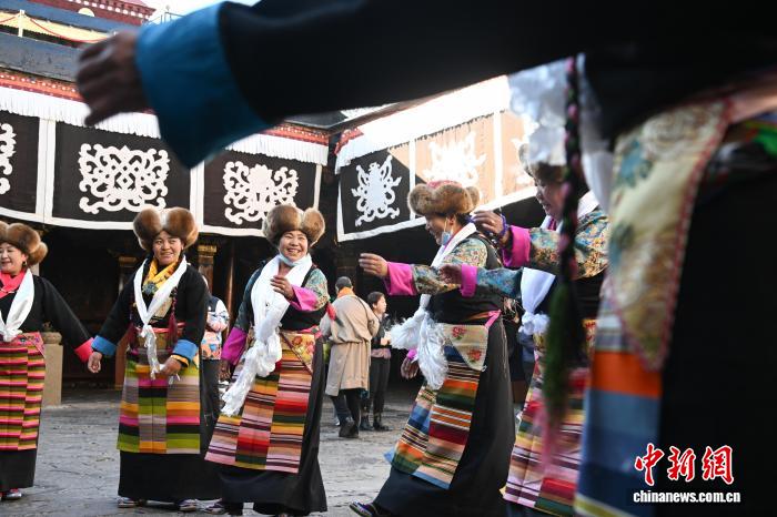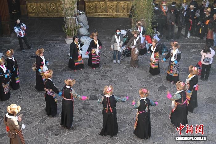 隨著藏歷十月十五白拉姆節(jié)(又稱“仙女節(jié)”)臨近,11月28日,西藏拉薩的婦女們?cè)诖笳阉绿饌鹘y(tǒng)舞蹈,迎接“仙女節(jié)”到來?!跋膳?jié)”即吉祥天母節(jié),藏語稱“白來日追”。相傳藏傳佛教最高護(hù)法神之一班丹拉姆的女兒白拉姆,不顧母親的反對(duì)與赤尊贊私定終身,班丹拉姆一怒之下將赤尊贊趕到拉薩河南岸,規(guī)定二人僅每年的藏歷十月十五日相見。中新社記者 貢嘎來松 攝