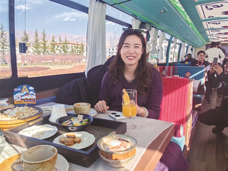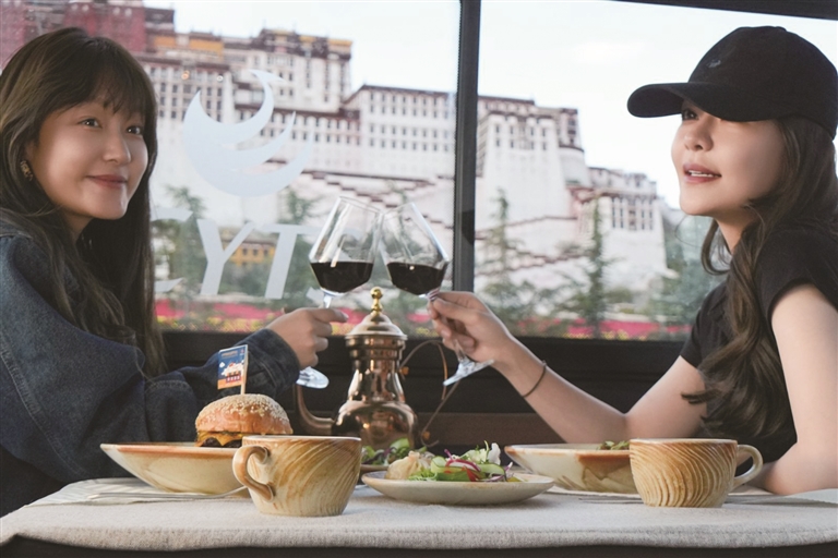 為了讓游客和市民能夠品嘗到最地道的拉薩美食,觀光巴士運(yùn)營方與拉薩多家知名餐廳展開了深度合作。乘車期間,游客可以圍爐煮茶,感受那份溫馨與愜意,品嘗果茶的清甜、干果的香脆與甜品的綿密交織在口中的美妙滋味;還可以喝上一杯用高原牦牛奶與醇厚紅茶小火慢熬而成的甜茶,搭配上融合藏式元素的精致茶點(diǎn),仿佛瞬間穿越到了拉薩當(dāng)?shù)厝说纳钪?,沉浸式體驗(yàn)他們的悠閑午后時(shí)光。