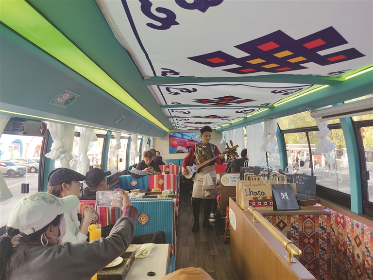 游客筱康從成都專程來到拉薩,通過網(wǎng)絡(luò)平臺(tái)了解到這輛觀光巴士后,毫不猶豫地購買車票前來體驗(yàn)。坐上巴士,窗外的風(fēng)景如同一幅流動(dòng)的畫卷,隨著車輪的前行緩緩展開。八廓商城的熱鬧繁華、布達(dá)拉宮的雄偉壯觀、拉薩河的寧靜秀麗、遠(yuǎn)處落日的余暉灑在大地上,川流不息的人群穿梭其中,側(cè)耳傾聽是城市的低語,煙火氣縈繞良久。而低頭品嘗著現(xiàn)做的美食,熱氣氤氳間,他深深感受到了這座城市的溫柔與魅力。筱康興奮地說:“我覺得這次體驗(yàn)感簡直太棒了!觀光巴士沿著拉薩主城區(qū)的路線行駛,沿途可以看到大昭寺、布達(dá)拉宮、羅布林卡、拉薩河、南山公園等眾多美麗的風(fēng)景。更重要的是,車上還可以品嘗到現(xiàn)做的美食,喝著甜茶,欣賞著特色節(jié)目,還能親眼看到工作人員制作酥油茶、甜茶的過程,品嘗青稞爆米花,這種全新的體驗(yàn)真的非常值得推薦!”