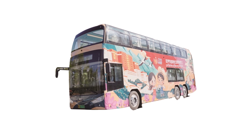 拉薩雙層美食主題觀光巴士車身以中國紅為主色調(diào),點(diǎn)綴著黑頸鶴、拉薩兒童笑臉及布達(dá)拉宮等標(biāo)志性景觀圖案,每一處細(xì)節(jié)都散發(fā)著濃郁的地域文化氣息。