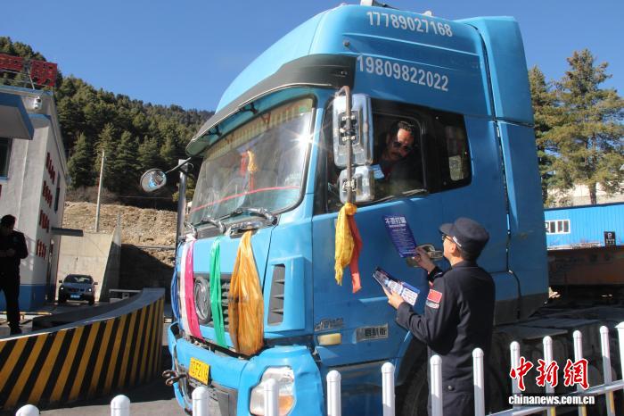 圖為西藏邊檢總站執(zhí)法調(diào)查支隊民警向過往車輛駕駛員開展宣傳。西藏邊檢總站執(zhí)法調(diào)查支隊供圖
