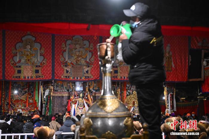 圖為工作人員將青稞酒倒入女神白拉姆像前的酒壇。中新社記者 貢嘎來松 攝