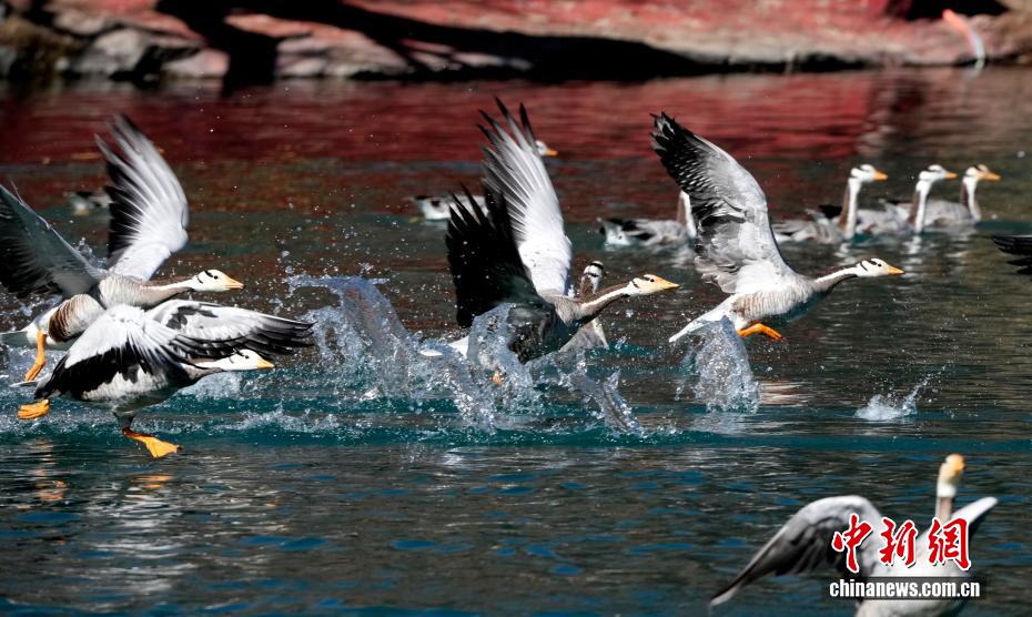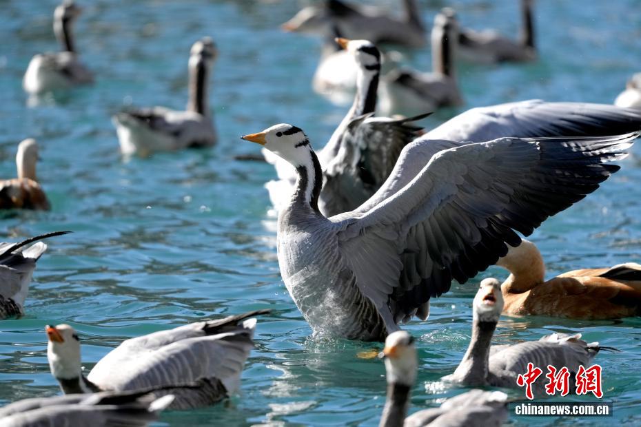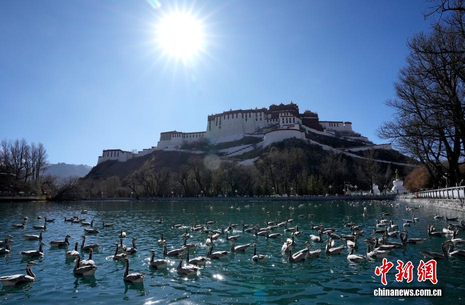 12月17日,西藏拉薩市區(qū)宗角祿康公園,大批斑頭雁“集結(jié)”越冬。成群結(jié)隊的斑頭雁等越冬候鳥吸引市民游客駐足觀賞、拍照留念。圖為宗角祿康公園越冬的斑頭雁。