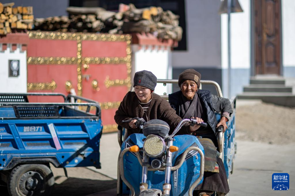 1月5日,定日縣長(zhǎng)所鄉(xiāng)森嘎村村民面帶笑容,騎三輪車出行。新華社記者 姜帆 攝