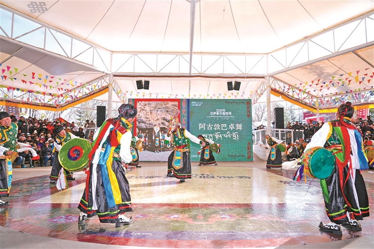 圖為2026拉薩新年服飾秀拉薩農(nóng)牧民婦女代表“村T秀”宗角祿康公園活動現(xiàn)場。