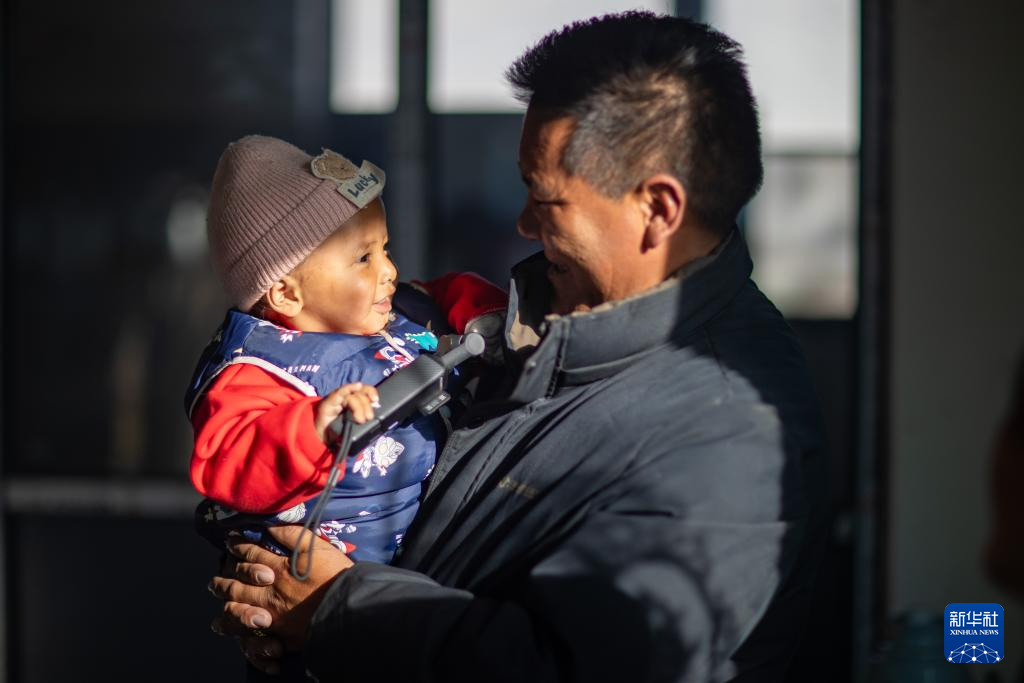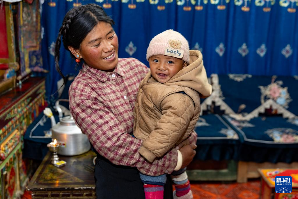 2025年11月11日,在西藏定日縣長所鄉(xiāng)雜村,母親朋瓊在剛裝修好的新房中抱著次仁拉巴。新華社記者 姜帆 攝