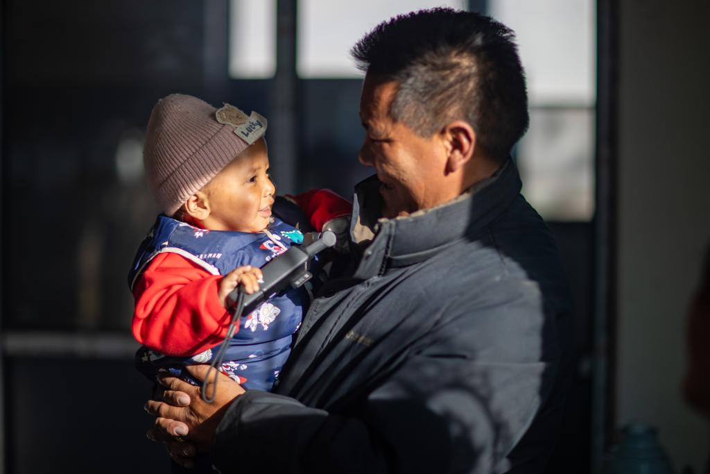 2026年1月5日,在西藏定日縣長所鄉(xiāng)雜村,長所鄉(xiāng)鄉(xiāng)黨委書記次仁旺堆(右)在次仁拉巴家中逗弄他。地震后在臨時板房居住期間,他曾當過寶寶的臨時保姆。新華社記者 姜帆 攝