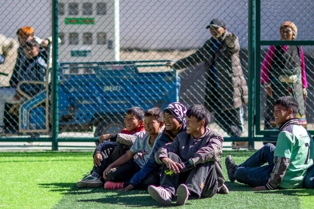 2026年1月5日,在森嘎村的足球場上,少年在觀看伙伴們踢球。新華社記者 姜帆 攝