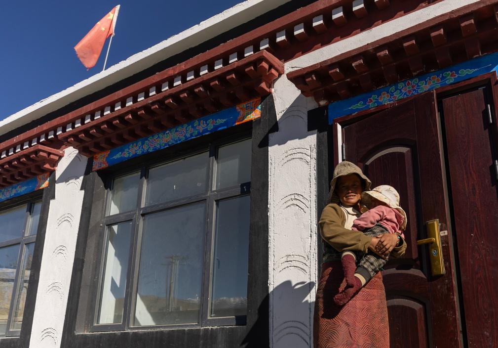 次仁拉姆在剛交付的新居前懷抱女兒格桑巴宗(2025年10月24日攝)。新華社記者 姜帆 攝