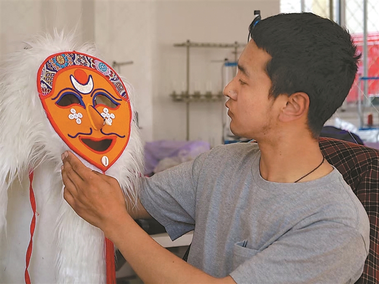 米瑪堅才在仔細端詳剛制作的藏戲面具。