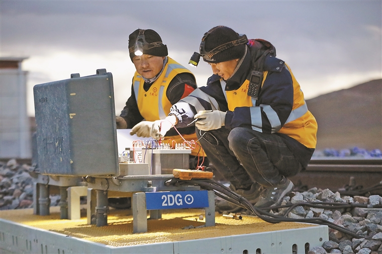 圖為近日,中國鐵路青藏集團(tuán)有限公司拉薩基礎(chǔ)設(shè)施段那曲信號車間扎加藏布信號工區(qū)職工在對信號機進(jìn)行電氣特性測試及數(shù)據(jù)記錄。記者 旦增蘭澤 通訊員 拉巴次仁 攝
