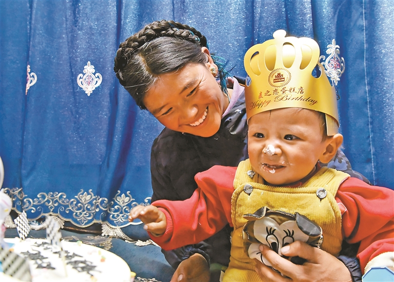 圖為1月8日,母親朋瓊正在為地震寶寶次仁拉巴過生日。記者 旦增蘭澤 攝