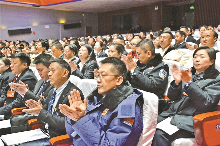 那曲市第二屆人民代表大會(huì)第七次會(huì)議開(kāi)幕會(huì)上,與會(huì)人員在聆聽(tīng)政府工作報(bào)告過(guò)程中,不時(shí)熱烈鼓掌。記者 汪純 攝
