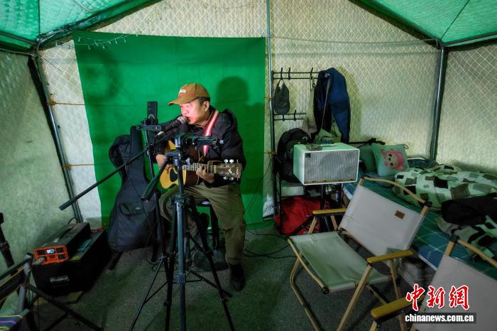 1月26日,拉薩市中華文化公園露營(yíng)地,來(lái)自江蘇南京的趙德春在帳篷內(nèi)彈吉他、唱民謠。江飛波 攝