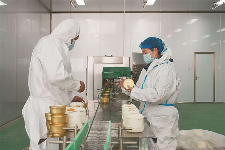 上圖:工人在檢查藏香雞罐裝殺菌、包裝一體化生產(chǎn)情況。