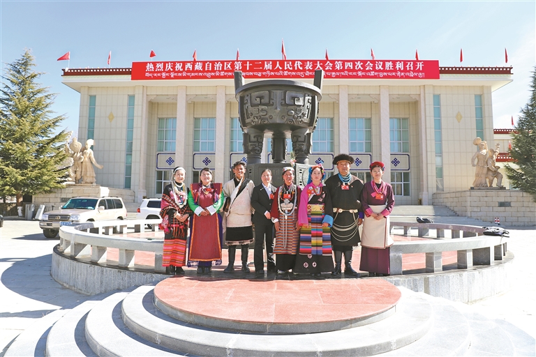 1月31日,來自7個(gè)民族的8位自治區(qū)人大代表,相“約”來到民族團(tuán)結(jié)寶鼎前,暢聊民族團(tuán)結(jié)進(jìn)步事業(yè)并合影,大家相約來年再聚。左起:玉珍(僜人)、次仁普只(門巴族)、加凳(藏族)、成海宏(漢族)、仁增(夏爾巴人)、仁青措珍(納西族)、達(dá)娃(珞巴族)、斗卓瑪(門巴族)。 西藏自治區(qū)人大宣傳中心 德吉曲珍 徐亮 攝