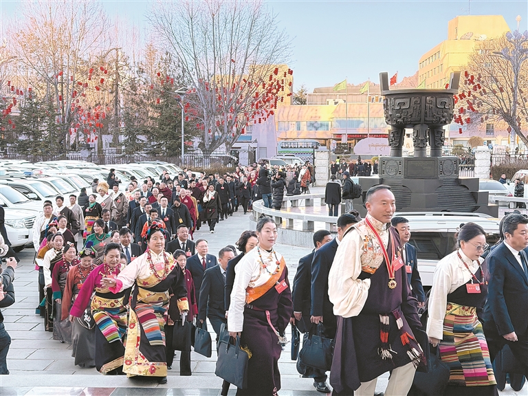 身著民族服飾的自治區(qū)人大代表步入會(huì)場。記者 次旦央吉 攝