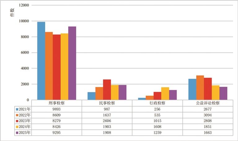 2021年—2025年全區(qū)檢察機關“四大檢察”業(yè)務趨勢變化圖
