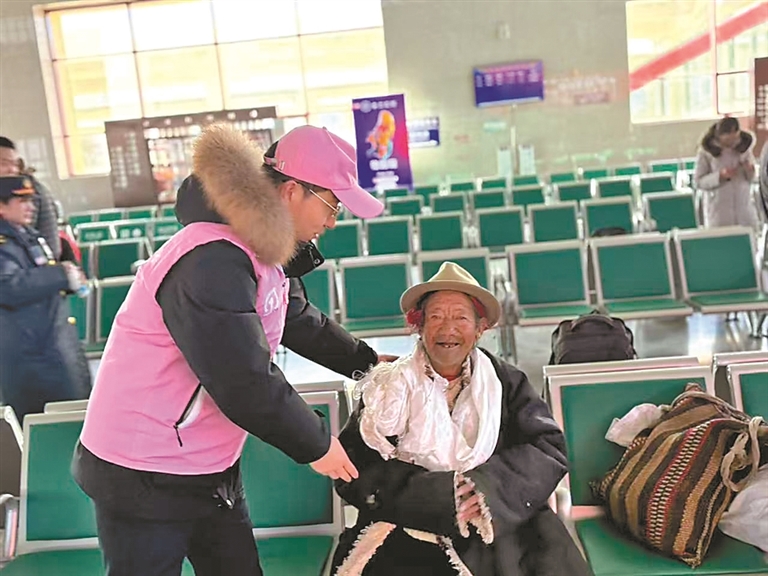 圖為在中國(guó)鐵路青藏集團(tuán)有限公司拉薩車務(wù)段日喀則站內(nèi),“小花朵青年志愿服務(wù)隊(duì)”志愿者在為旅客提供服務(wù)。記者 鹿麗娟 攝