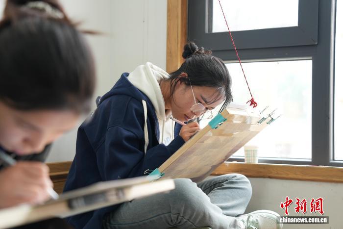 圖為畫室內(nèi)學徒練習繪畫唐卡。貢確 攝