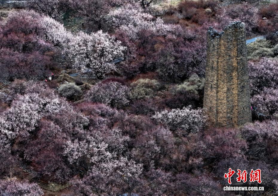 3月27日,西藏林芝市工布江達(dá)縣秀巴古堡群下桃花綻放。時(shí)下,西藏林芝市的千余株野生桃樹次第綻放,美不勝收。(無人機(jī)照片)中新社記者 李林 攝
