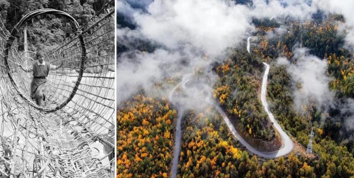 拼版照片:左圖是墨脫縣雅魯藏布江上的藤橋(20世紀(jì)80年代資料照片,新華社記者 顧綬康 攝);右圖是2020年11月5日拍攝的派墨公路米林段公路。新華社發(fā)