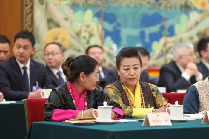 3月6日,十四屆全國人大四次會(huì)議西藏代表團(tuán)舉行開放團(tuán)組會(huì)議。圖為會(huì)前,全國人大代表次仁措姆(左)和格桑卓瑪交流。