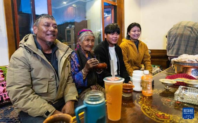 家住西藏山南市扎囊縣桑耶鎮(zhèn)的老人格桑美多,見證了西藏從封建農(nóng)奴制到社會(huì)主義新天地的滄桑巨變。圖為格桑美多老人(左二)和家人一起看電視。新華社發(fā)