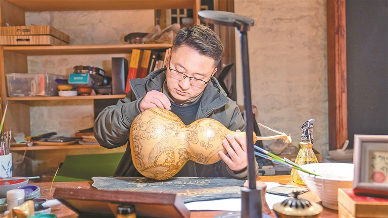 就像做掐絲葫蘆,他會(huì)先有線稿,但最終會(huì)根據(jù)葫蘆本身的形狀與色澤,讓唐卡圖案與掐絲紋樣在制作中相互調(diào)整、逐步呈現(xiàn)。“就像草原上的河,它有它的流向,你只需順著它的流勢(shì),稍加引導(dǎo)就好。”這種“因材施藝、順勢(shì)而為”的創(chuàng)作態(tài)度,讓他的作品既有手作的溫度,又透著一股生動(dòng)的自由。