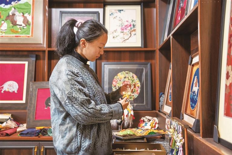 早上9點(diǎn)半,羅布的女兒巴桑德吉準(zhǔn)時(shí)坐在工作臺前,起稿、裁剪、堆貼、繡制……一枚枚精巧雅致的“堆繡”胸針,在她指尖慢慢成型。在日復(fù)一日的專注與堅(jiān)守中,這位年輕傳承人,正用創(chuàng)新與熱愛,讓古老的傳統(tǒng)手藝煥發(fā)新生。