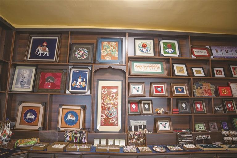 一旁的展示臺上,各類配飾與胸針錯落擺放、琳瑯滿目。東側(cè)墻面上,唐卡、服飾與各式文創(chuàng)產(chǎn)品相映成趣。巴桑德吉告訴記者,拉薩“堆繡”唐卡作為國家級非遺項(xiàng)目,以堆、貼、繡、嵌為核心工藝,融合多種刺繡技法,用料考究、工序繁復(fù),是西藏極具代表性的文化瑰寶。為守住技藝的原汁原味,團(tuán)隊(duì)始終堅(jiān)持純手工制作、不批量生產(chǎn)、不追求速度,實(shí)行朝九晚六、無硬性任務(wù)的工作模式,杜絕因趕工影響作品質(zhì)量。憑借扎實(shí)手藝與獨(dú)特文化內(nèi)涵,產(chǎn)品深受消費(fèi)者青睞。
