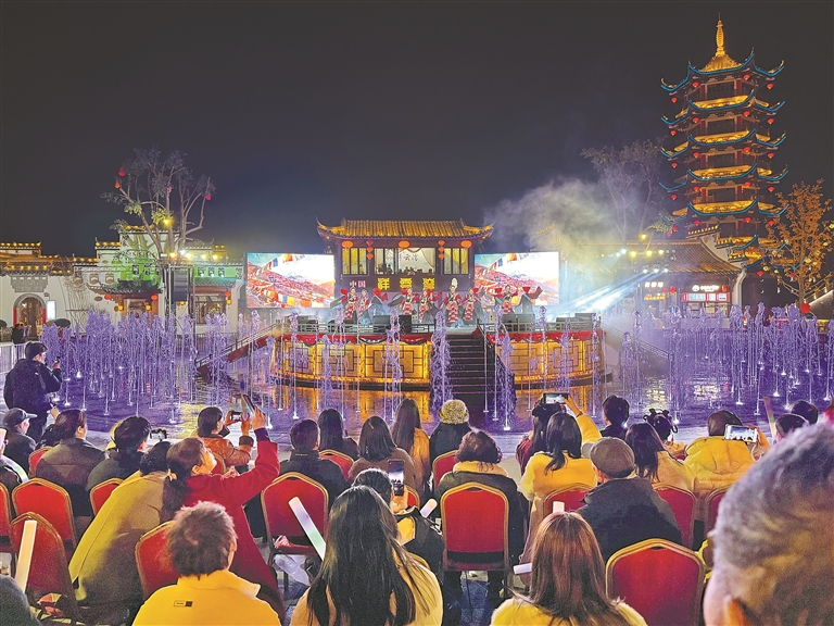 在湖北省云夢縣博物館里,古老藏戲與千年秦簡隔空對話;在祥云灣文旅景區(qū)音樂噴泉舞臺上,《吉祥昂仁》藏戲舞演員宛如格桑花盛開在水光瀲滟間;在楚王天下大舞臺上,《大鵬山》六弦琴音雄渾豪邁、舞步粗獷奔放,將神山的巍峨與雪域的壯闊搬到江漢平原;在胡金店萬畝油菜花海中,《多彩的哈達》為春日花海增添了濃郁的民族風情;在安陸、孝昌等周邊縣市,《同心結(jié)·幸福緣》舞蹈節(jié)奏歡快、《日喀則我為你牽掛》三重唱旋律悠揚,將高原遼闊與南國柔美完美融合……
