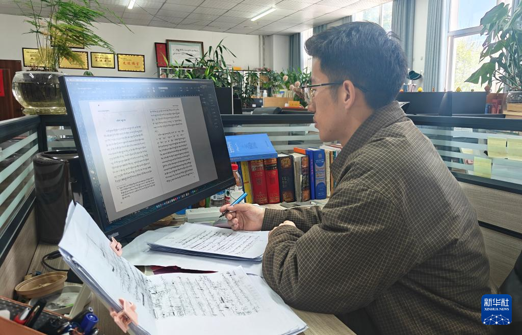 仁青正在??薄恫杞?jīng)》藏譯本。新華社記者春拉 攝