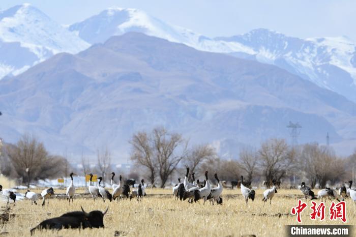 圖為拉薩林周縣黑頸鶴保護(hù)區(qū)內(nèi),黑頸鶴正在覓食、嬉戲。貢嘎來松 攝