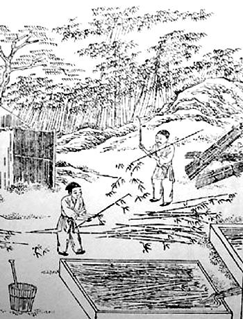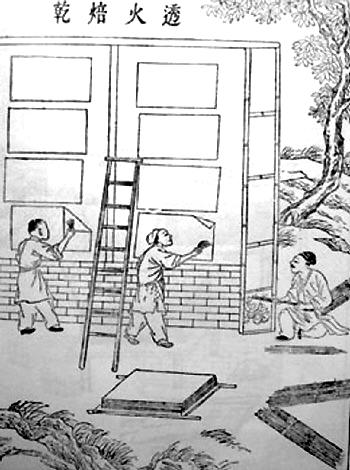 18世紀(jì)末,清乾隆年間由中國畫師手繪的竹紙制造全套工藝流程工筆設(shè)色組畫,由在京的法國耶穌會士蔣友仁寄往巴黎。竹紙制造系列圖共24幅,具有宮廷畫師畫風(fēng),因其兼具藝術(shù)和技術(shù)的雙重價值,在歐洲不斷被人臨摹?,F(xiàn)知多套彩色摹本分別藏于巴黎國家圖書館、法蘭西研究院圖書館及德國萊比錫書籍博物館等地。1815年巴黎出版的《中國藝術(shù)、技術(shù)與文化圖說》中公布了其中的13幅,這些圖為后世有關(guān)造紙技術(shù)的專著爭相引用。此組畫重點向歐洲人展示了抄紙竹簾的型制及用法、濕紙人工干燥技術(shù)和植物黏液的使用等。明代宋應(yīng)星的《天工開物》于18世紀(jì)傳到巴黎,1840年法蘭西學(xué)院漢學(xué)教授儒蓮將其中“殺青”(造紙)一章譯成法文,刊于《法蘭西科學(xué)院院刊》上,后又在另一刊物上發(fā)表了有關(guān)“竹紙制造”的論文。
