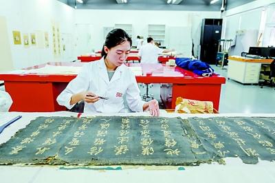 一名修復(fù)師在故宮文物醫(yī)院修復(fù)室修復(fù)故宮收藏的書法作品。新華社記者 劉潺攝