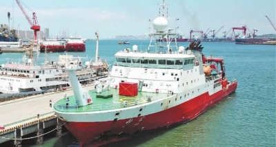 堅持和發(fā)展中國特色社會主義,實現(xiàn)中華民族偉大復興,必須堅定不移貫徹科教興國戰(zhàn)略和創(chuàng)新驅動發(fā)展戰(zhàn)略,堅定不移走科技強國之路。圖為靠泊在山東青島母港的“科學”號準備解纜起航。